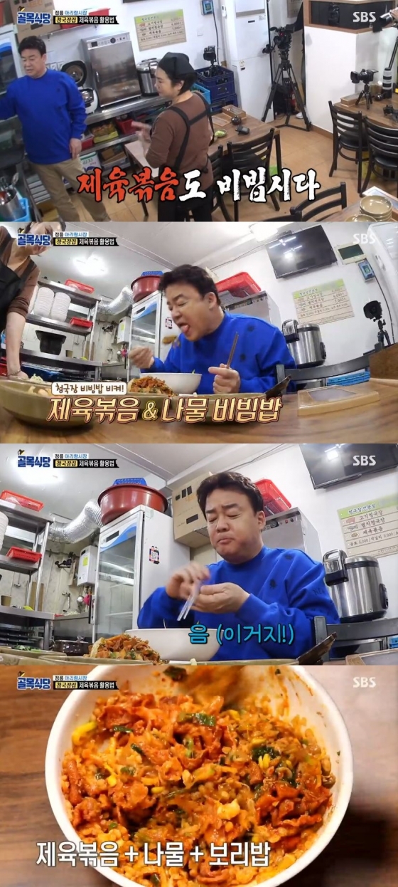 백종원은 제육볶음과 나물들을 섞어 밥을 비벼 먹으며 만족스러운 미소를 지었다.