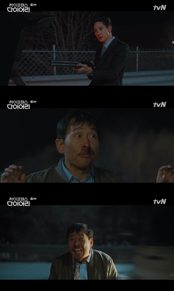 12일 방송된 tvN 수목드라마 '싸이코패스 다이어리'(극본 류용재·김환채·최성준, 연출 이종재·최영수) 8회에서는 서인우(박성훈 분)에게 자신이 포식자 부류임을 증명하기 위해 한밤 중 고속도로로 뛰어들어 사고를 당하는 남성철(조석현 분)의 모습이 그려졌다.