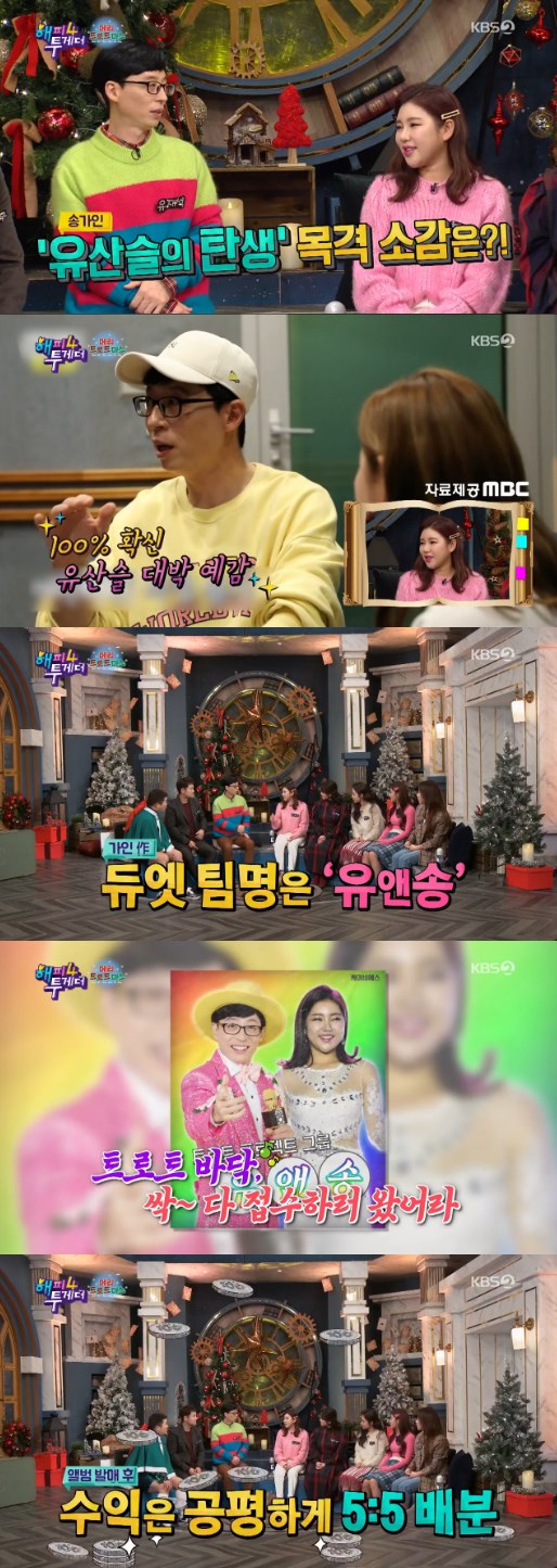 '해피투게더4'에서 '트로트대세' 송가인이 '트로트 신인' 유산슬(유재석)과 듀엣을 하고 싶다고 말했다.