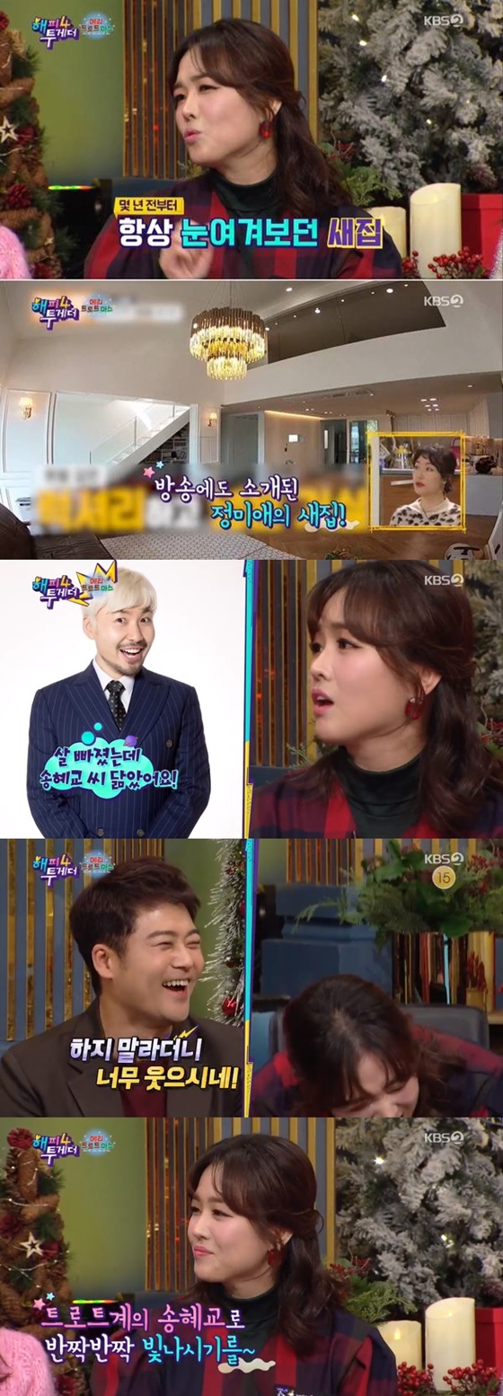 정미애는 "우리 집이 경기도 쪽이라 집값이 그렇게 막 비싸지 않은데 항상 눈여겨보던 집이 있었다"며 "꼭 가고 싶다는 생각을 항상 가지고 있었는데 이번에 가게 됐다"고 알려 박수를 받았다. 그녀는 "아이들도 되게 좋아한다. '요즘 집에만 있고 싶다'고 하더라"며 행복함을 전했다.