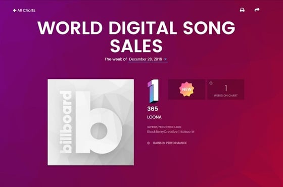 미국 빌보드가 최근 발표한 자료에 따르면 이달의 소녀의 리드 싱글 '365'가 빌보드 월드 디지털 송 세일즈 차트에서 1위를 차지했다.