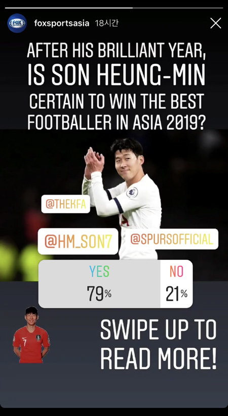 지난 28일 ‘폭스 스포츠 아시아’는 인스타그램 스토리 기능을 해 한 가지 설문조사를 진행했다. 설문조사는 “빛나는 한 해를 보낸 손흥민이 2019 베스트 풋볼러 인 아시아를 수상할까’였다. 예/아니오로 진행된 설문조사에서 참여자의 80%가량이 손흥민의 수상을 점쳤다.