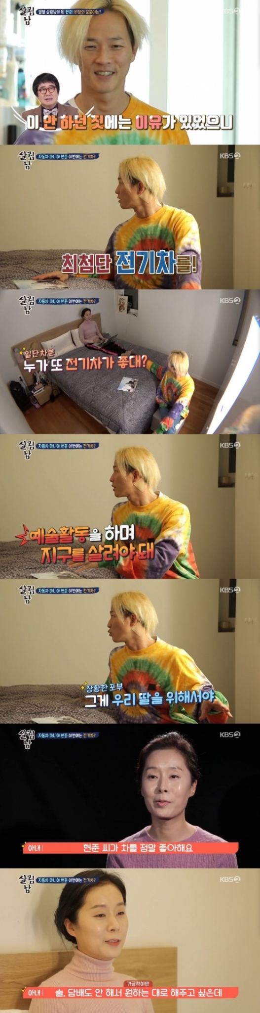 팝핀현준은 아내에게 전기차를 사고 싶다는 마음을 내비쳤다. 팝핀현준은 "예술활동을 하면서 동시에 지구를 살려야 해. 그게 우리 딸을 위해서야"라고 설득하려 했다. 그러자 아내는 "우리 차 산 지 별로 안됐잖아"라고 말했다.