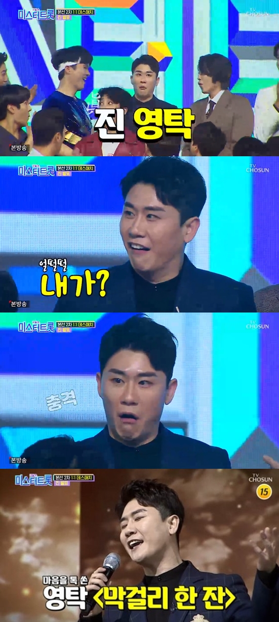 영탁은 이날 마스터가 뽑은 진으로 선정됐다. 지난 무대에서 '막걸리 한 잔'을 부른 영탁은 자신의 이름이 호명 되자 놀라는 모습을 보이며 ""내가?"라고 얼떨떨해 했다. 영탁은 '미스터트롯'을 하면서 진을 할 것이라고는 생각을 못했다고 털어놨다.