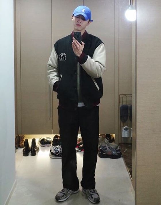 사진 속 주우재는 LA다저스 모자와 뉴욕 양키스 상의를 입은 채 핸드폰을 응시하고 있다.