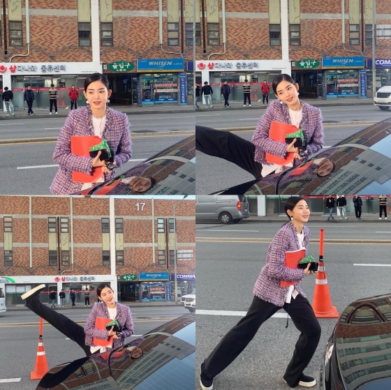 하지만 밑에는 검은색 와이드 슬랙스와 운동화를 신어 반전 코디를 선보였다.
