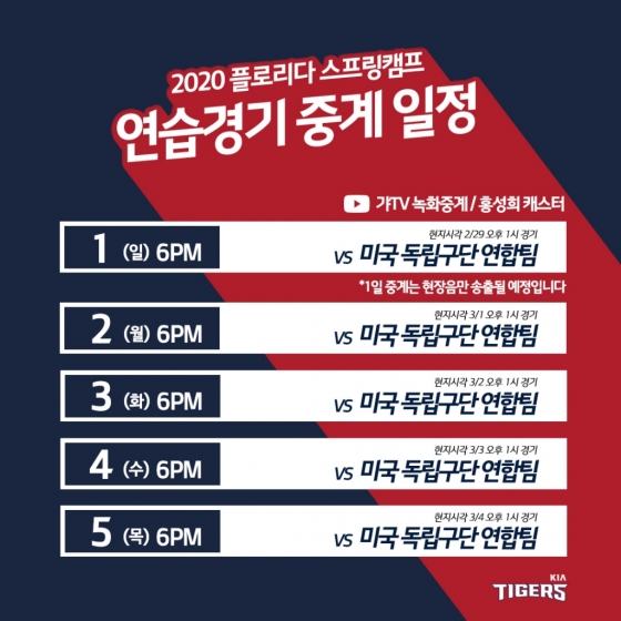 KIA는 27일 "내달 1일(이하 한국시간)부터 5일까지 플로리다 포트마이어스 테리파크에서 진행되는 미국 독립리그 연합팀과 연습경기 5경기를 중계할 예정"이라고 밝혔다.