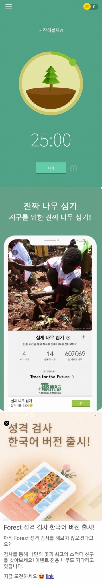 포레스트는 스마트폰을 멀리해 집중력을 높이고 효율적인 생활 습관을 양성해주는 애플리케이션이다. 핸드폰을 멀리할 수록 애플리케이션에 존재하는 나무를 심고 가꿀 수 있다.