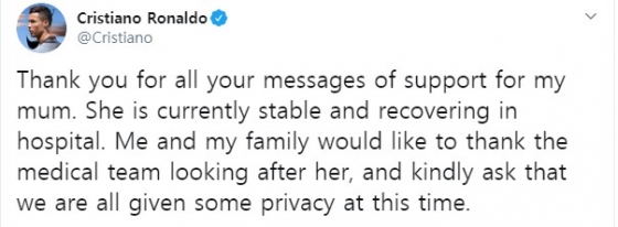 호날두는 자신의 SNS를 통해 "우리 어머니를 응원해줘서 고맙다. 현재 병원에서 안정을 취하고 있다. 회복중이다. 의료팀에 감사하다. 우리 사생활을 지켜달라는 부탁을 하고 싶다"라고 적었다.