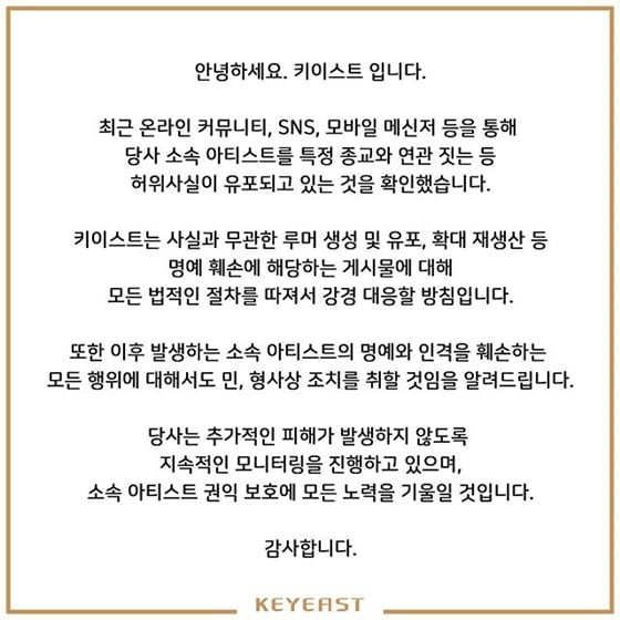 이어 "키이스트는 사실과 무관한 루머 생성 및 유포, 확대 재상산 등 명예훼손에 해당하는 게시물에 대해 모든 법적인 절차를 따져서 강경 대응할 방침입니다"라고 덧붙였다.