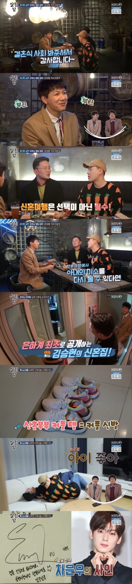 4일 오후 방송된 KBS 2TV 예능 프로그램 '살림하는 남자들 시즌2'에서는 김승현 신혼집 집들이에 나선 변기수, 윤형빈의 모습이 담겼다.