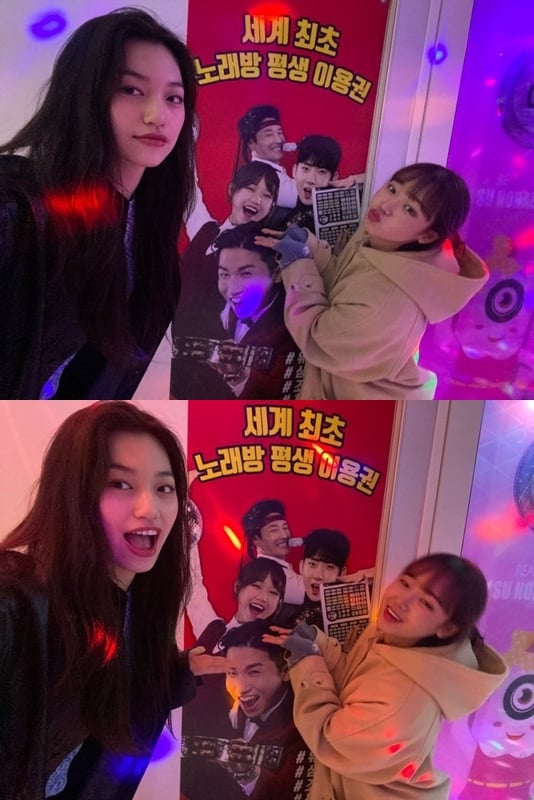 사진 속 최유정은 노래방에 붙어있는 자신의 사진 앞에서 입술을 내미는 귀여운 표정을 지었다. 또 옆 같은 그룹 멤버 김도연은 카리스마 있는 표정으로 카메라를 응시했다.