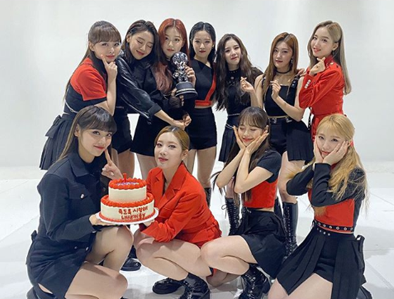 공개된 단체 사진 속 이달의 소녀는 음악 방송 1위 기념 트로피와 케이크를 들고 밝게 웃는 모습이다.