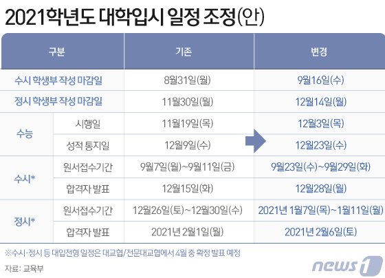 뉴스1에 따르면 교육부는 31일 신학기 개학일이 5주 이상 늦춰지면서 오는 11월 19일로 예정된 2021학년도 수능을 오는 12월 3일로 2주 연기한다고 밝혔다. 겨울에 실시되는 수능은 1993년 이후 처음이다.