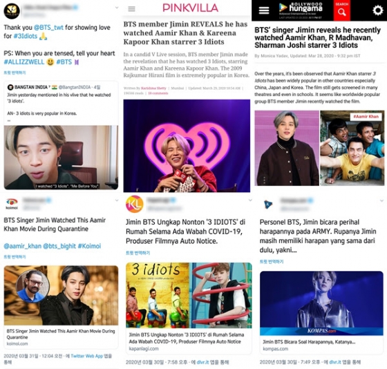 인도 최대 연예매체 'PINKVILLA'에서도 "지민이 브이 라이브 중 '세 얼간이', '인셉션', '노트북', '미 비포 유'와 같은 영화를 봤다고 언급했으며, 영화에 대한 그의 각별한 애정을 엿볼 수 있었다"고 보도했다.
