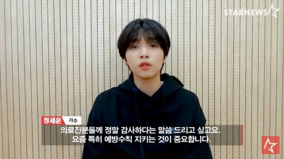 정세운은 영상에서 "요즘 코로나19 확산으로 많은 분들이 피해도 입고 고통스러운 나날들을 보내고 계시고 의료진 분들도 많이 고생도 하시는데 다시 한 번 우리를 위해 치료와 극복에 힘써 주시는 의료진 분들에게 감사하다는 말씀 드리고 싶다"라고 운을 떼고 "예방 수칙을 지키는 게 중요하다. 마스크를 써야 하는 것, 손을 씻는 것을 유념해서 힘든 시기를 잘 이겨냈으면 좋겠다"라고 말했다.