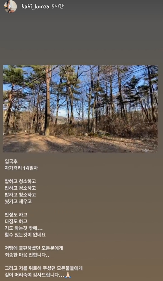 가희는 글을 통해 "입국 후 자가격리 14일차. 밥하고 청소하고, 밥하고 청소하고, 밥하고 청소하고, 씻기고 재우고"라며 "반성도 하고, 다짐도 하고, 기도하는 것밖에...할수 있는 것이 없네요"라고 했다.