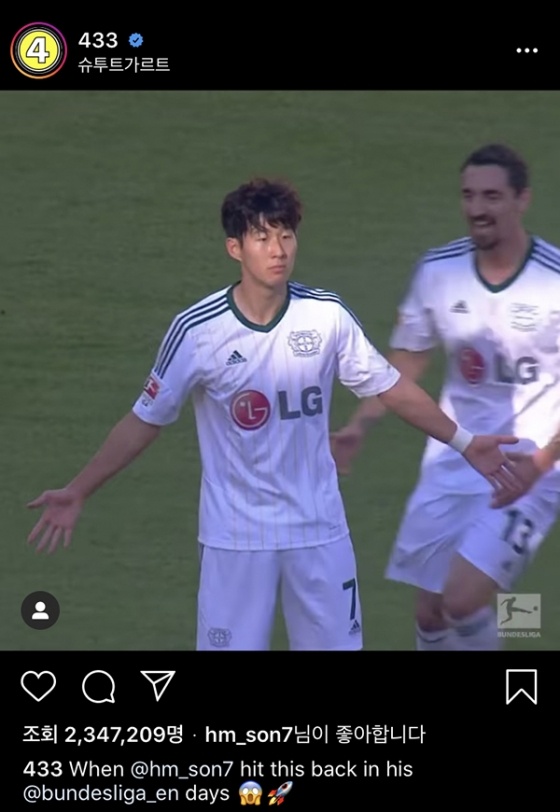 계정은 로켓 이모티콘을 사용하며 믿을 수 없다는 반응과 함께 박수를 보냈다. 손흥민 역시 게시물에 '좋아요'를 하며 화답했다.