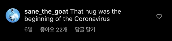 한 팬이 득점 후 동료들과 포옹하는 손흥민의 모습에 “저 포옹부터 코로나19가 시작됐다”라며 인종 차별성 댓글을 달았다. 해당 댓글은 22개의 공감을 얻기도 했다.