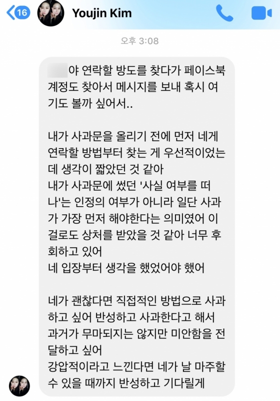 또한 "사실 제가 했던 많은 잘못들을 저는 잊고 살았습니다. 최근 제가 했던 잘못들을 생각하며 겁도 나고 회피도 하고싶었지만 제가 아닌 상처받은 분들을 생각하니 죄송하다는 형식적인 말보다는 제 모든 잘못을 하나 하나 모두 나열하고 인정하는 것이 피해를 입은 분들에게 조금이나마 사죄를 드릴수 있는것 같았습니다"라며 직접 피해자에게 사과하겠다고 밝혔다.