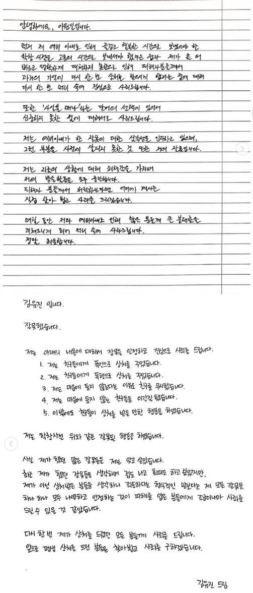 김유진PD는 "잘못했습니다. 저는 친구들에게 폭언으로 상처를 주었습니다. 저는 친구들에게 폭행으로 상처를 주었습니다. 저는 마음에 들지 않는다는 이유로 친구를 무시했습니다. 저는 마음에 들지 않는 친구들을 이간질 했습니다. 이밖에도 친구들이 상처를 받을 만한 행동을 하였습니다"라며 자신의 학창시절 잘못들을 다섯 항목으로 풀어 사과했다.