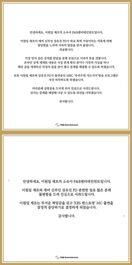 같은날 김유진PD와 이원일 셰프는 이원일의 인스타그램에 추가 사과문을 올렸다. 이원일은 "제 예비 아내로 인해 즐겁고 행복한 시간으로 보냈어야 할 학창 시절을 고통의 시간으로 보내셔야 했다는 점과 제가 좀 더 빠르고 명확하게 대처하지 못함으로 인해 피해자분들께서 과거의 기억에 다시 한 번 상처를 받으시게 했다는 점에 대해 다시 한 번 머리 숙여 진심으로 사죄 드립니다"라며 "'사실을 떠나'라는 단어의 선택에 있어서 신중하지 못한 점에 대해서도 사죄드립니다"라고 밝혔다.