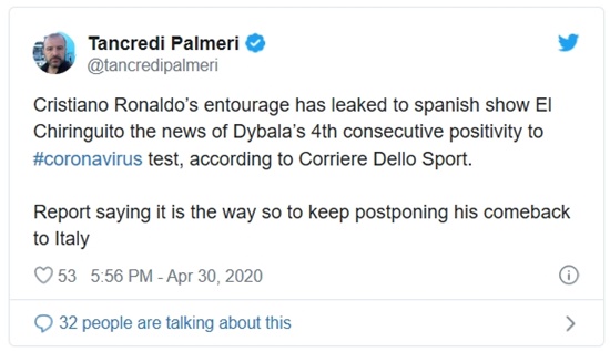 이탈리아의 ‘코리에 델로 스포르트’는 4월 30일(현지시간) “호날두의 한 측근이 디발라가 지난 6주 동안 네 차례 코로나19 양성 판정을 받았다는 것을 언론에 흘렸다”고 보도했다. 이 매체는 “현재 호날두는 고향인 포르투갈의 메데이라에 머물고 있는데, 코로나19가 여전히 확산세인 이탈리아에 돌아가고 싶지 않아서 ‘디발라 알람’을 울렸다”고 썼다.