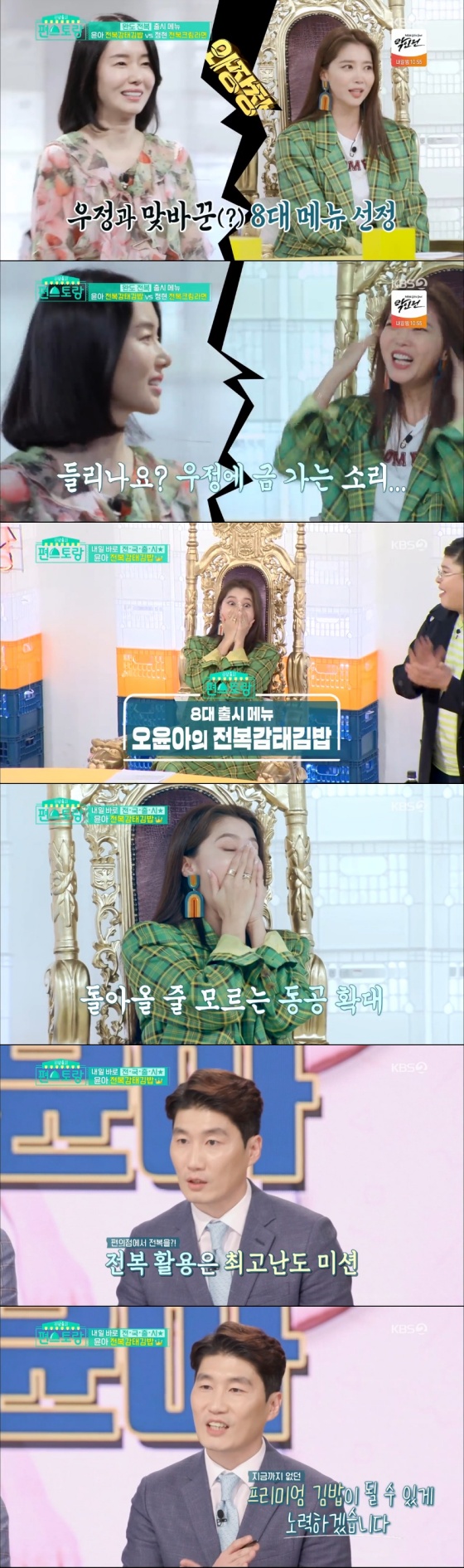 '편스토랑'에서 오윤아와 이정현이 요리 대결을 하며 6년 우정이 무색할 기싸움을 벌였다.