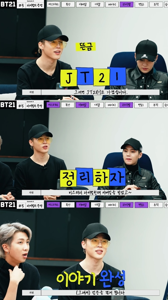 이에 멤버들은 다시 BT21에 몰입해 의견을 제시했고, 지민은 의견을 다시 총정리해 "이런 거죠. 미스터리 라이벌한테 이메일을 받았고, 그리고 우리(BT21) 내에서 변화가 일어나 갈등을 겪게 됩니다"라며 이야기를 완성시켜 눈길을 끌었다.