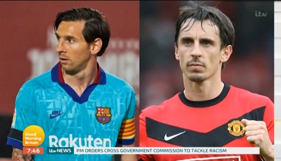 화면에는 메시의 지난 13일 마요르카전 모습과 게리 네빌의 현역 시절 사진이 비교되어 나왔다.