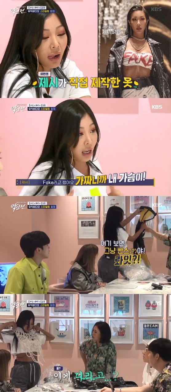 이날 방송에서 제시는 '후 댓 비'(Who dat B) 뮤직비디오 의상을 공개했다. 의상을 직접 제작했다는 제시는 가슴 의상에 'FAKE'라고 적힌 이유에 대해 "가짜니까 내 가슴이"라고 고백해 웃음을 자아냈다. 제시는 'FAKE'라고 적힌 상의를 몸에 대보며 당당한 포즈를 취해 눈길을 끌었다.