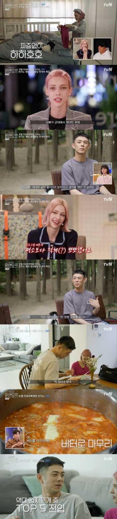 미초바는 빈지노에 대해 "좋은 일도 안 좋은 일도 같이 할 수 있는 좋은 친구다"라고 했고, 빈지노는 "나는 (같이 사는 것을) 엄청 강추한다. 내가 약해질 수 있는 부분에서 많은 도움이 된다"라고 애정을 드러냈다.