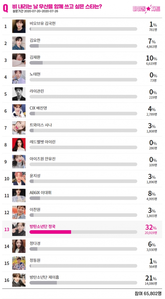 아이돌차트에서 지난 20일부터 26일까지 진행된 '비 내리는 날 우산을 함께 쓰고 싶은 스타는?'이라는 설문에서 정국은 총 6만 5802표 중 2만 919표(득표율 32%)를 획득해 1위에 올랐다.
