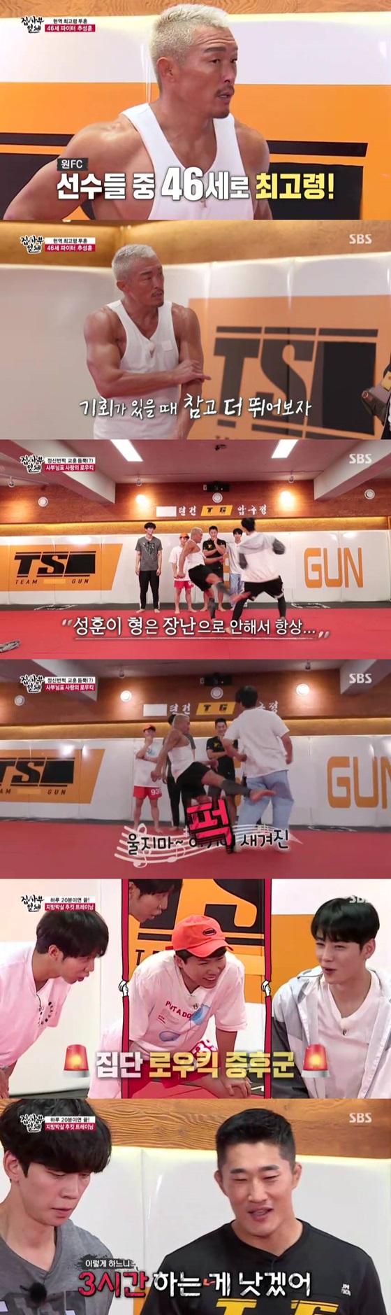 현역 선수 중 최고령이라는 추성훈은 여전히 압도적인 피지컬은 물론 왼팔 근육이 끊어지는 부상을 입었음에도 "수술해야 하지만 수술하면 오래 쉬어야 하지 않냐. 나도 이제 나이가 있어 나중엔 하고 싶어도 할 수 없다"고 말해 멤버들의 감탄을 자아냈다.