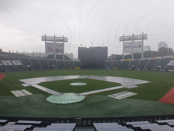 서울도 마찬가지였고, 잠실구장 또한 비에 젖었다. 일찌감치 방수포가 깔린 상태였지만, 외야 워닝트랙의 경우 많은 물이 고인 상태다.