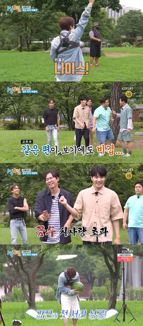 한 사람 당 만원의 상금을 걸고, 제작진과의 수박 뺏기 대결이 진행됐다. 첫 주자 김선호는 달리기 중 수박을 놓쳐서 산산조각이 났다. 이에 멤버들은 깨진 수박에 달려들어 수박을 먹었다. 라비는 "뭘 안 주는데 이렇게까지 해?"라며 당황했다.