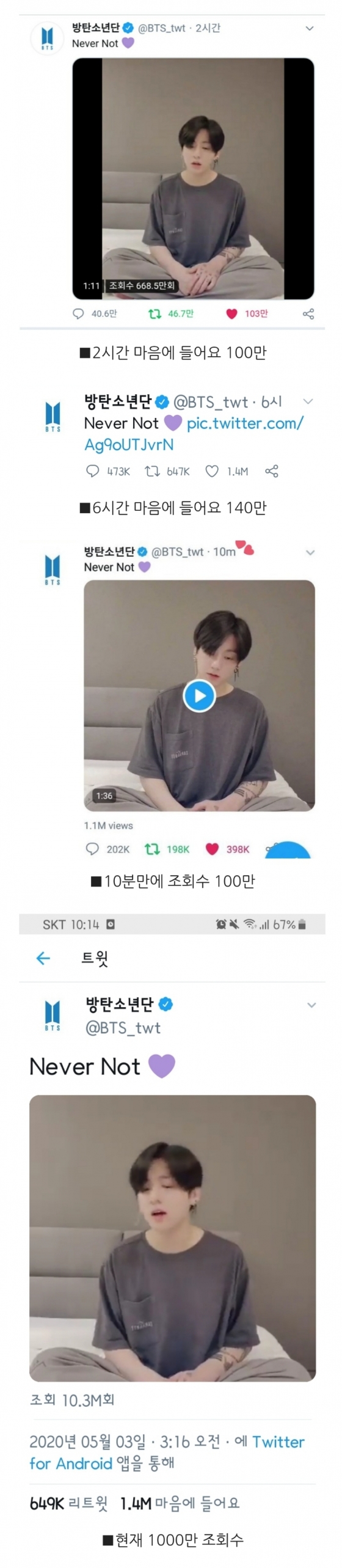 지난 5월 3일 방탄소년단 공식 트위터에 정국이 '네버 낫(Never Not)♥'이라는 제목으로 게재한 트윗은 24일 오전 2시 49분께 300만 '마음에 들어요'(좋아요)를 돌파했다.