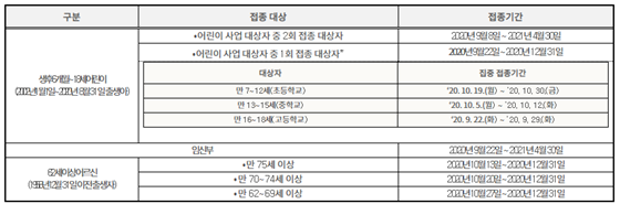 접종대상에 따라 접종기간도 다르다. 생후 6개월~18세 어린이 중 2회 접종 대상자는 2020년 9월 8일부터 2021년 4월 30일까지 접종 가능하다. 또 어린이 중 1회 접종 대상자는 2020년 9월 22일부터 2020년 12월 31일 사이 접종할 수 있다.