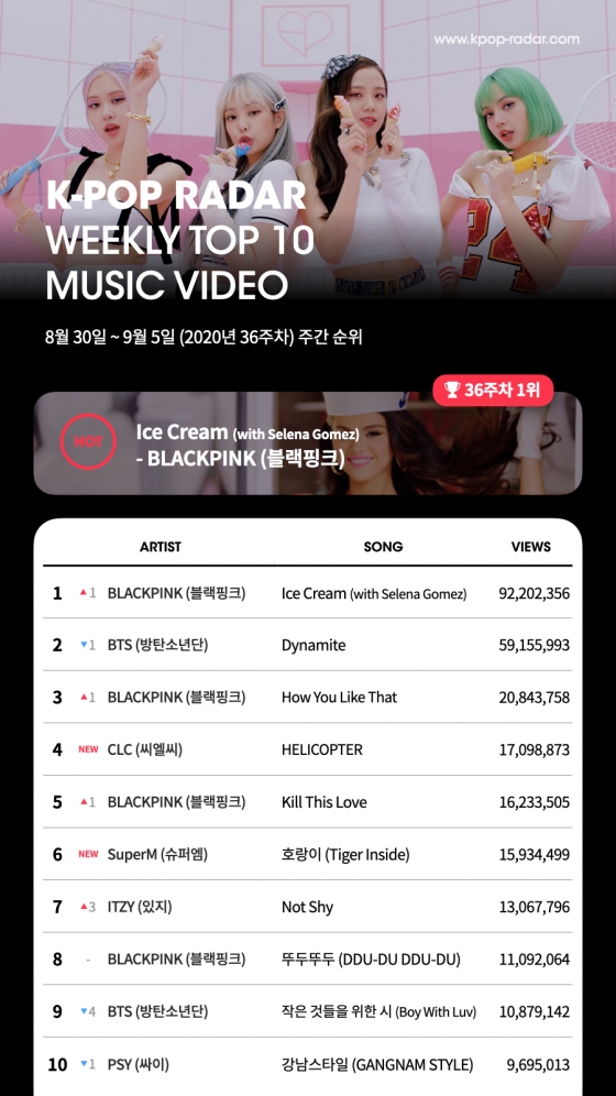 블랙핑크 신곡 'Ice Cream'(with Selena Gomez) 뮤직비디오는 케이팝 레이더 2020년 36주 차(8월 30일~9월 5일) 차트에서 9,220만 뷰를 기록하며 1위에 올랐다. 이는 지난주 대비 한 계단 상승한 성적이다.