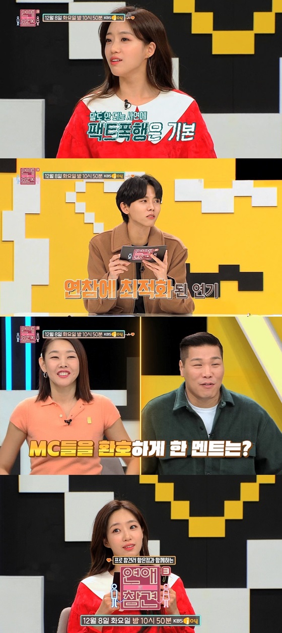 최근 녹화에서 함은정은 "나는 참견하는 걸 좋아하는 오지라퍼인데, 막상 내 상황이 되면 이성이 마비된다"며 "다각도로 얘기해주는 MC들 말 들으면서 사이다 먹는 기분으로 방송을 챙겨보고 있다"고 '연애의 참견' 애청자임을 밝혔다.