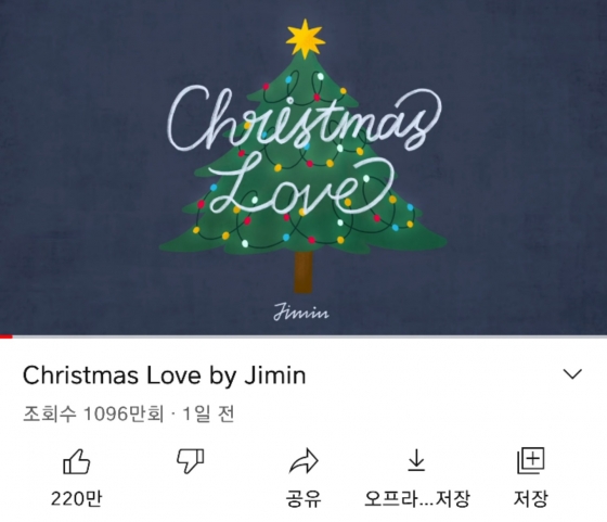 지난 24일 공개된 지민의 '크리스마스 러브'는 다음 날인 25일 단숨에 1000만 뷰를 넘어서고 '좋아요' 200만을 돌파해 한국 유튜브 오디오 영상 역대 최단 신기록을 수립했다.