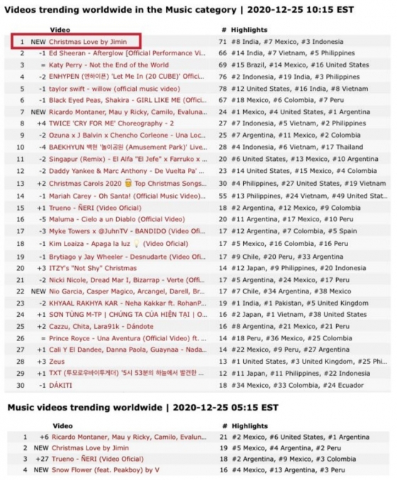 뿐만 아니라 지민의 '크리스마스 러브'는 미국, 일본, 영국, 호주, 러시아, 이탈리아, 사우디아라비아, 브라질, 스페인 등 무려 71개국 유튜브 음악 부분 인기 동영상에 올랐으며, 그중 20개 국가에서 모든 부분 인기 동영상에 랭크됐다.