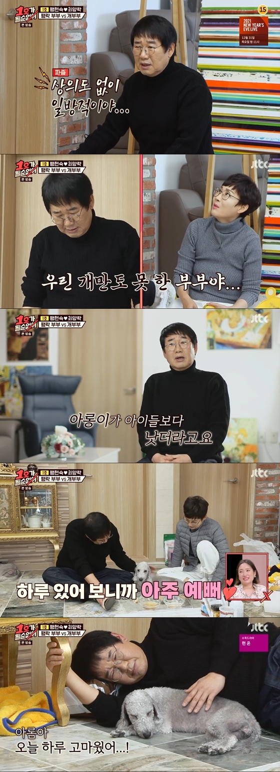팽현숙♥최양락 부부는 개부부를 하루 동안 돌보게 됐다. 평소 개를 무서워한다던 최양락은 "상의도 없이 데려왔냐"며 분노했지만, 팽현숙은 "이 개부부의 아이를 입양하기로 했다. 이미 계획에 있었다. 난 키울 거다"며 단호하게 답했다.