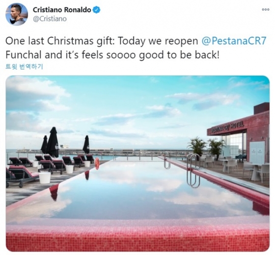 호날두는 26일(한국시간) 자신의 SNS에 "마지막 크리스마스 선물을 받았다. 오늘 푼샬의 호텔이 문을 다시 열었다. 너무 기분 좋다"고 적으며 호텔 수영장 사진을 게재했다.