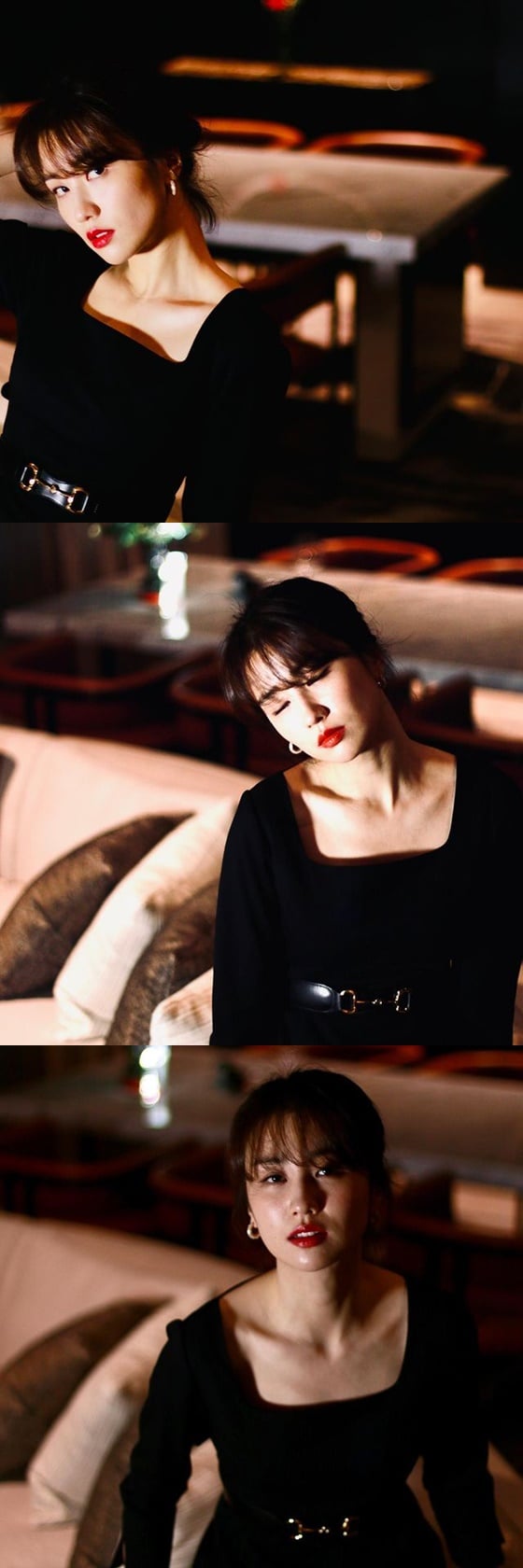 이어진 사진에서는 수수하고 청순미 넘치는 자태를 뽐냈다. 마지막 사진에서는 올블랙 원피스에 레드 립으로 포인트를 완성했다.