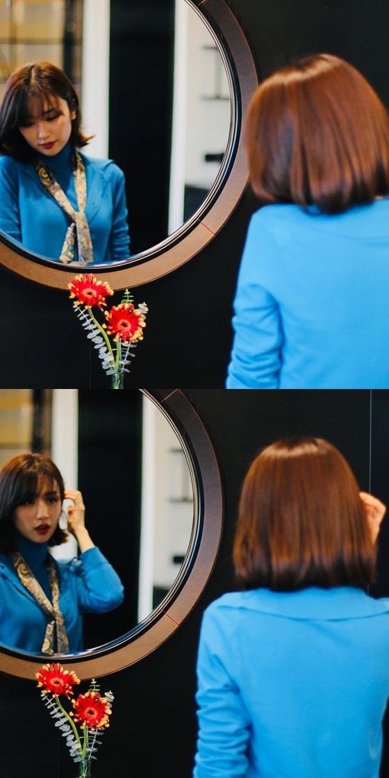 공개된 사진 속 박하선은 푸른색 계열의 상의를 입고 거울 앞에서 포즈를 취하고 있다. 흐릿해도 붉은색으로 립에 포인트를 줘 매혹적인 매력을 발산했다.