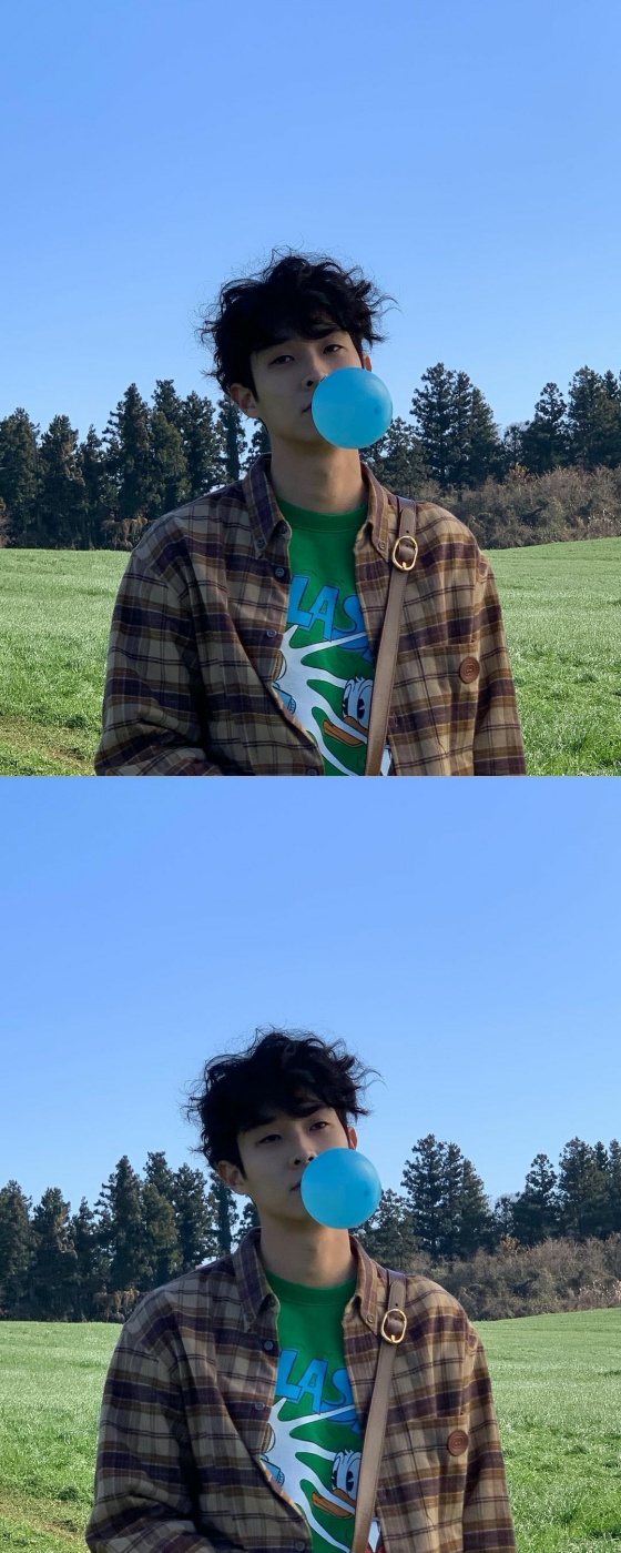 사진 속 최우식은 입에 풍선을 문 채 멍한 표정을 짓고 있다. 곱슬곱슬한 베이비펌은 동안을 자랑하는 최우식의 비주얼과 잘 어우러져 상큼한 분위기를 연출했다. 푸른 배경은 동화 속 한 장면 같은 인상을 주기도 한다.