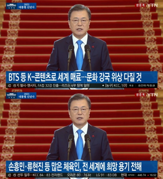 스포츠 분야에 대한 지원도 약속했다. 문 대통령은 "훌륭한 기량을 갖춘 우리 스포츠 선수와 지도자들도 그 자체로 대한민국을 알리는 K콘텐츠"라며 "지난해 손흥민, 류현진, 김광현 선수를 비롯한 많은 체육인이 우리 국민과 세계인에게 희망과 용기를 줬다"고 말했다.