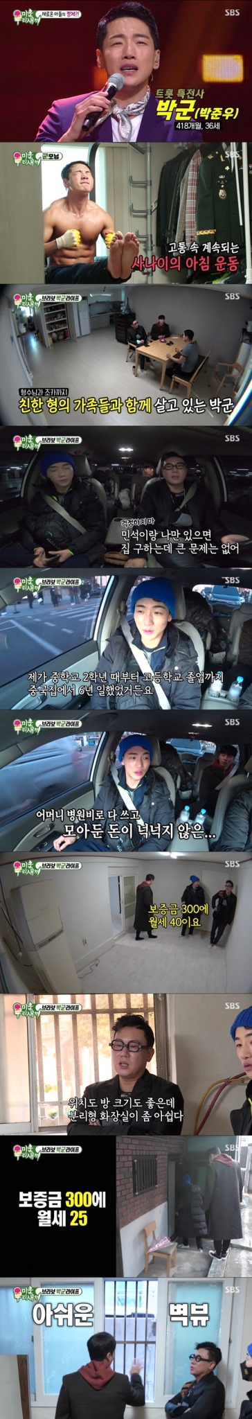 집을 구하기 위해 가는 차 안에서 박군은 힘들었던 지난 삶을 털어놓았다. 15세의어린나이에 박군은 "말기암인 어머니의 병간호를 위해 중국집에서 6년 동안 일하며 돈을 벌었다"고 고백했다. 이어 "어머니의 병원비를 마련하기 위해 특전사에 지원했는데, 모은 돈을 모두 어머니의 병원비로 다 쓰고 나니 현재 돈이 넉넉치 않다"며 "보증금 500만원에 월세 30~40만원의 집을 찾고 있다"고 언급했다.