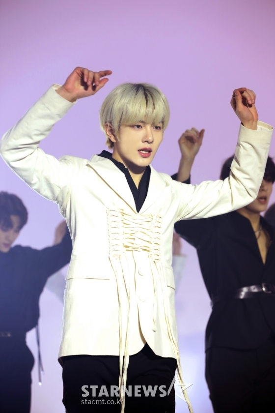 그룹 골든차일드 최보민이 25일 오후 온라인으로 진행된 다섯 번째 미니앨범 'YES.' 발매 기념 쇼케이스에서 멋진 무대를 선보이고 있다.